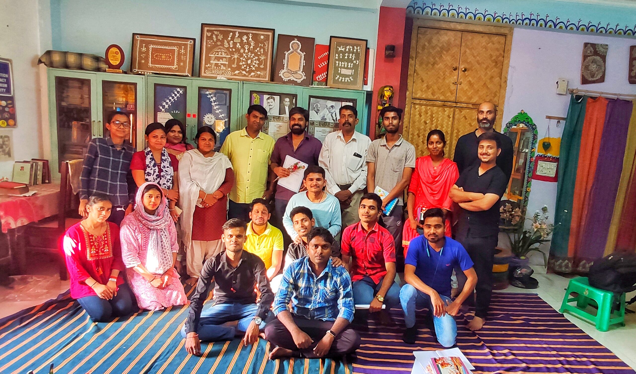 कार्यक्रम का दूसरा चरण धुरी केंद्र के भीतर आयोजित किया गया, जहाँ बच्चों ने हाथों से रंग भरने (Hand Painting) की गतिविधि में भाग लिया। छोटे-छोटे नन्हे हाथ जब लाल, नीले, पीले और हरे रंगों से सजे, तो वह दृश्य अपने आप में किसी त्योहार से कम नहीं था।